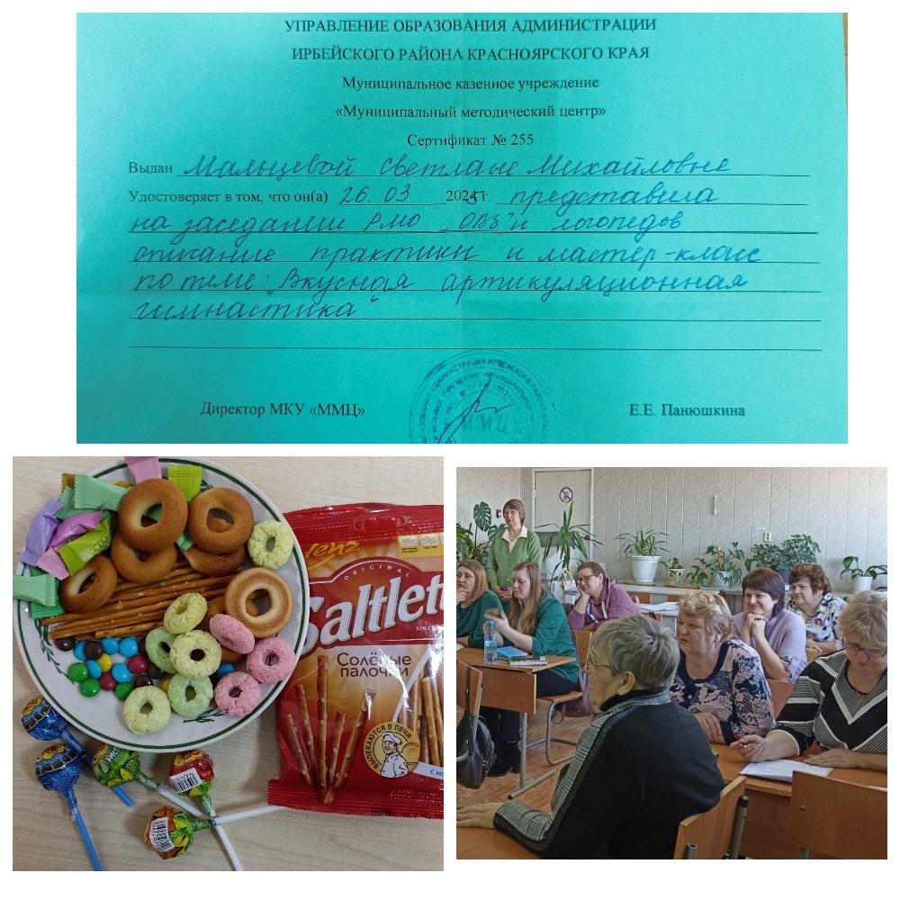На базе МКУ "ММЦ" 26 марта 2025 года прошло последнее заседание РМО логопедов в этом учебном году. Я поделилась практикой и провела мастер-класс "Вкусная артикуляционная гимнастика". Это увлекательный и эффективный способ развития речи у детей. Дошколята не только улучшают навыки артикуляции, но и наслаждаются процессом обучения. Педагоги активно включились и с удовольствием выполняли гимнастику с "вкусняшками" (печенье, конфетки, соломка, сушки, чупа-чупс, варенье). Презентацию "Вкусная артикуляционная гимнастика" можно посмотреть в методичес