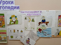 Оформление кабинета. Уголок "УРОКИ ЛОГОПЕДИИ - чистоговорки в картинках"